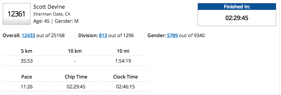 In the end I finished with a 2:27:11 time, running about an 11:06 min/mile pace.